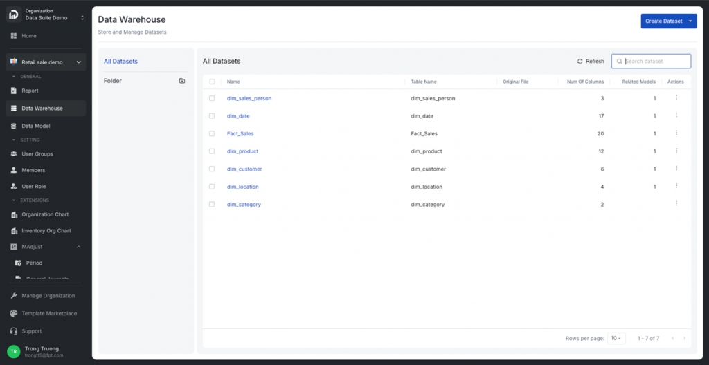 FPT Data Suite tích hợp đầy đủ các công cụ phân tích hiện đại phục vụ mọi cấp độ người dùng. Giao diện trực quan hỗ trợ tạo biểu đồ, bảng tổng hợp linh hoạt như Pivot Table và Slicer, giúp người dùng khai thác dữ liệu đa chiều và hiệu quả hơn. Nền tảng còn hỗ trợ xây dựng mô hình dữ liệu quan hệ, cho phép tạo Calculated Fields để kết nối và chuẩn hóa dữ liệu từ nhiều bảng khác nhau.