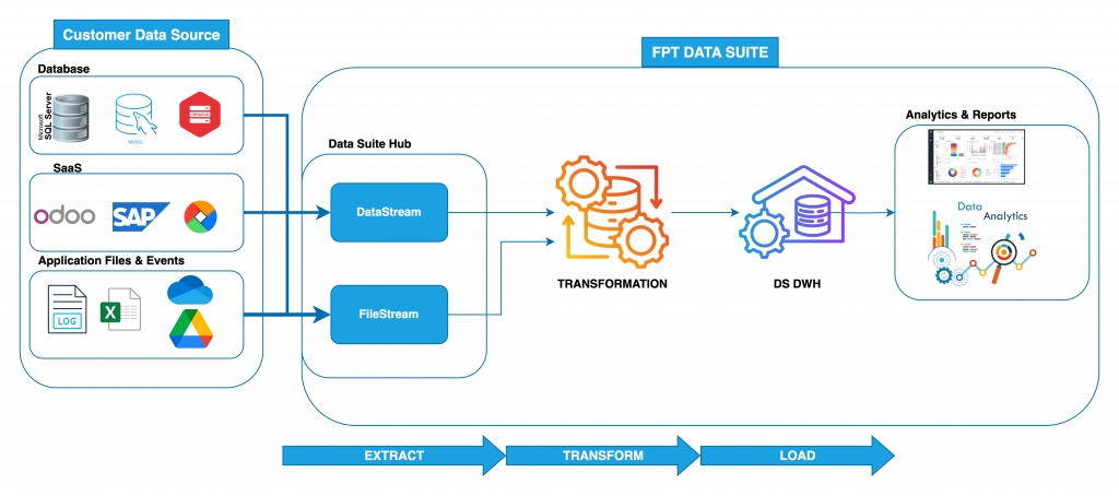 Dữ liệu được kết nối từ nhiều nguồn phổ biến như Google Drive, OneDrive, Pub/Sub… và được tối ưu truy vấn qua kiến trúc Analytical Data Warehouse. FPT Data Suite cũng hỗ trợ tích hợp các công cụ mã nguồn mở như Airflow, DBT, Spark, Logstash – giúp hệ thống linh hoạt mở rộng và tùy chỉnh theo nhu cầu vận hành thực tế.