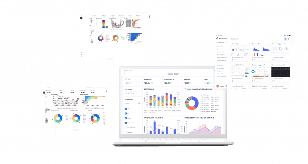 FPT Data Suite là nền tảng phân tích và trực quan hóa dữ liệu do FPT Smart Cloud phát triển, được thiết kế để giải quyết toàn diện bài toán quản trị và khai thác dữ liệu trong doanh nghiệp, từ SMEs đến các tập đoàn lớn, dễ dàng khai thác và hành động dựa trên dữ liệu. Với triết lý “mạnh mẽ cho chuyên gia, đơn giản cho người dùng phổ thông”, FPT Data Suite giúp mọi nhân sự – nền tảng này cho phép bất kỳ nhân sự nào – dù không có nền tảng kỹ thuật – cũng có thể tạo báo cáo, phân tích dữ liệu và ra quyết định chỉ sau vài thao tác kéo – thả.